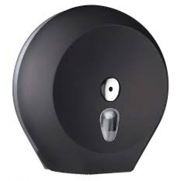 Диспенсер для туалетной бумаги серии black. Малый. Круглый, чёрного цвета.  Материал : пластик. Размеры: 273х270х128 мм. Ёмкость: макс. Ø рулона 230 мм.  Оборудован антивандальным замком и окошком для контроля наличия туалетной бумаги.