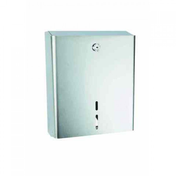 Диспенсер для туалетной бумаги в рулонах 250-300 м, выполнен из окрашенной нержавеющей стали белого цвета. industrial Имеет защитный ключ, окошко для контроля уровня бумаги внутри и фронтальную загрузку рулона бумаги. Размеры: 290х230х115 мм. Макс. Ø 220 мм, втулка Ø 40 мм.